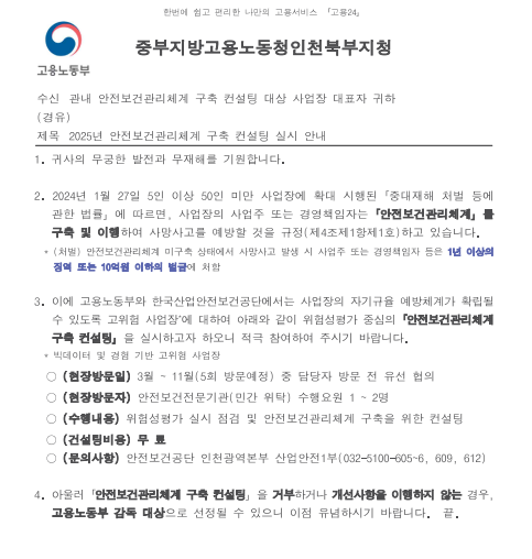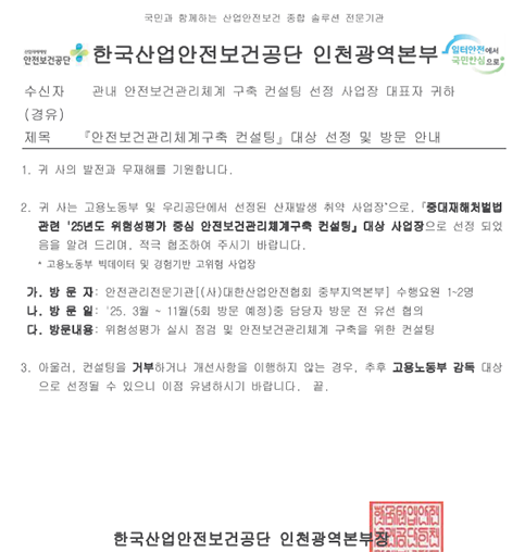 | 경고사항 | 컨설팅 거부 또는 개선사항 미이행 시 고용노동부 감독 대상으로 선정될 수 있음 |